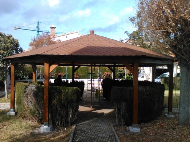 Diseñado para cenadores de forma hexagonal u octogonal, este tipo de tejado cuenta con múltiples vertientes inclinadas que convergen en un punto central.